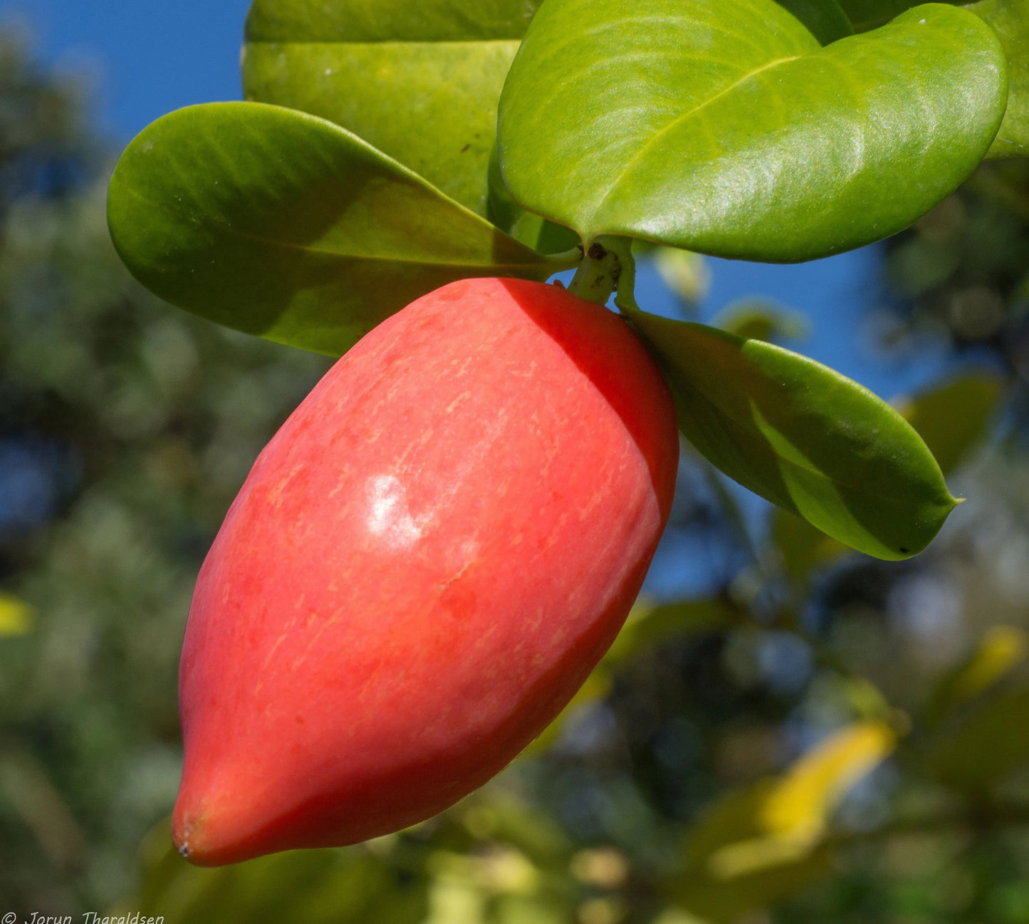 Carissa macrocarpa, commonly known as Natal plum or Large Num-Num, is a species of flowering shrub native to South Africa. Here's a description: