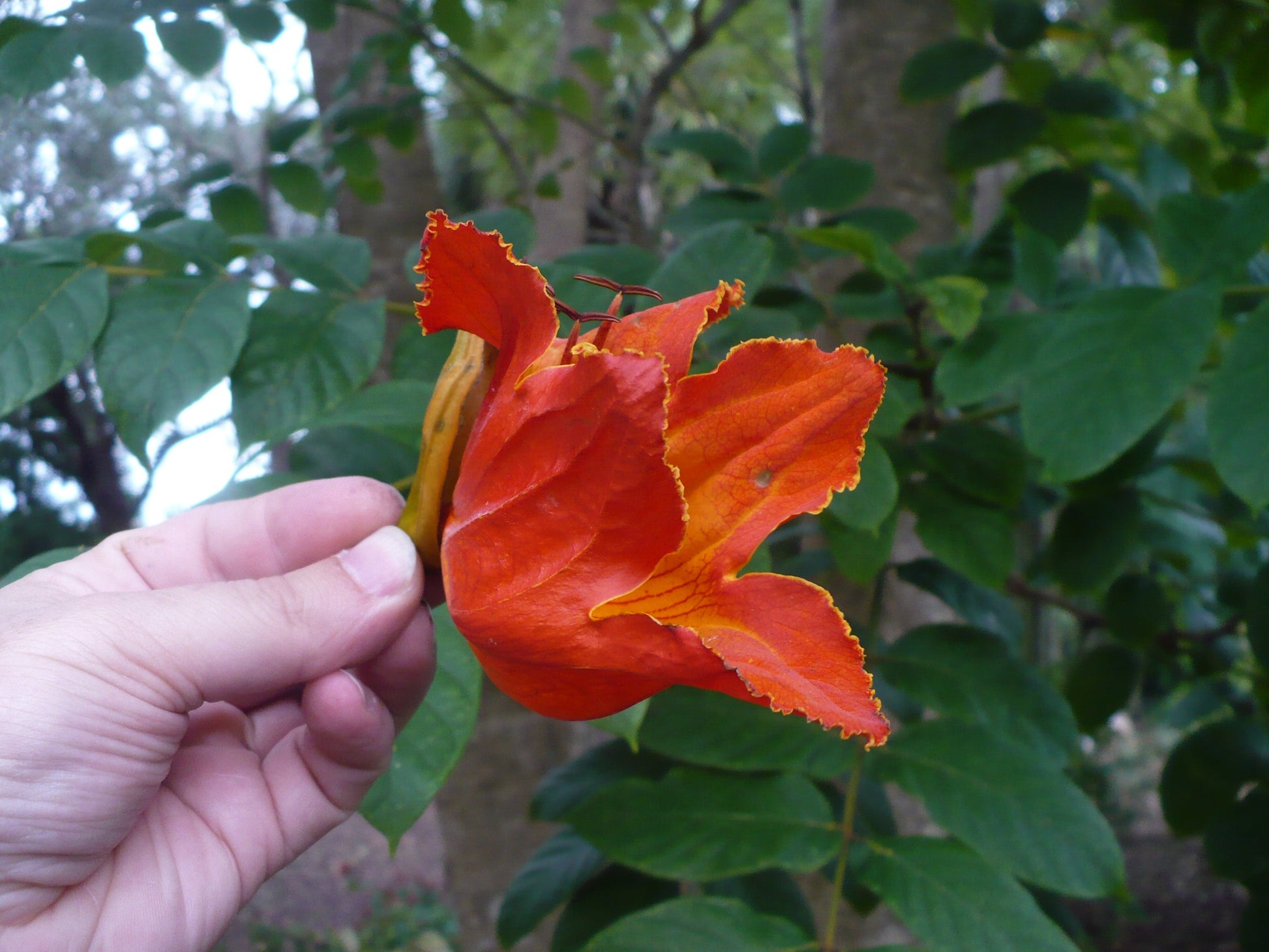 Flowers: The flowers are large and trumpet-shaped, with a flaring, five-lobed corolla. They are typically bright orange or red, resembling tulip flowers, which gives the tree its common name. The flowers are arranged in clusters at the tips of the branches.