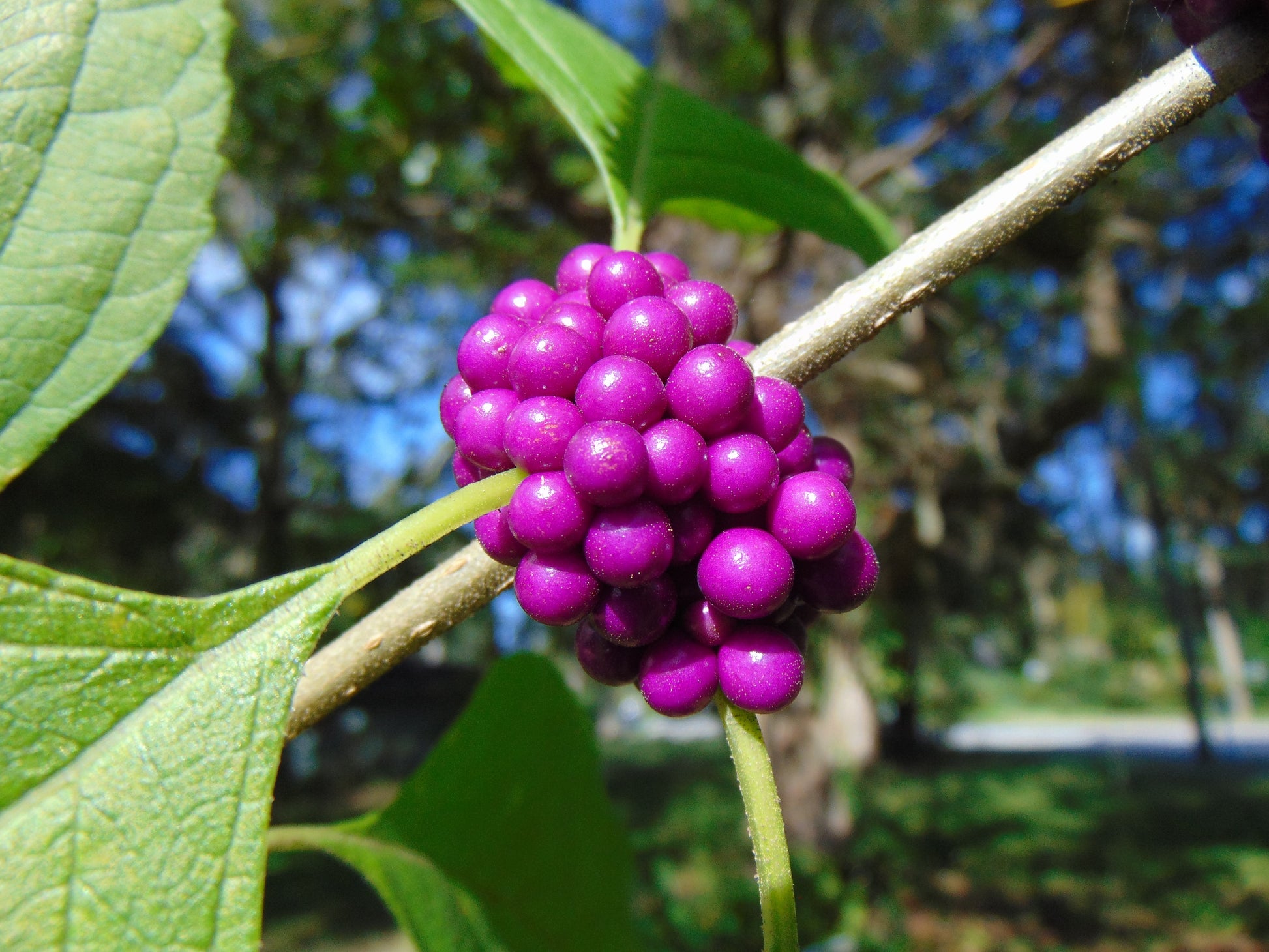 Berries: One of the most distinctive features of Callicarpa americana is its clusters of bright purple berries, which typically appear in late summer to early fall. These berries are arranged tightly along the stems and persist well into the winter, adding a pop of color to the landscape. While the berries are not edible for humans, they are highly attractive to birds and other wildlife, making American beautyberry a valuable plant for wildlife gardens.