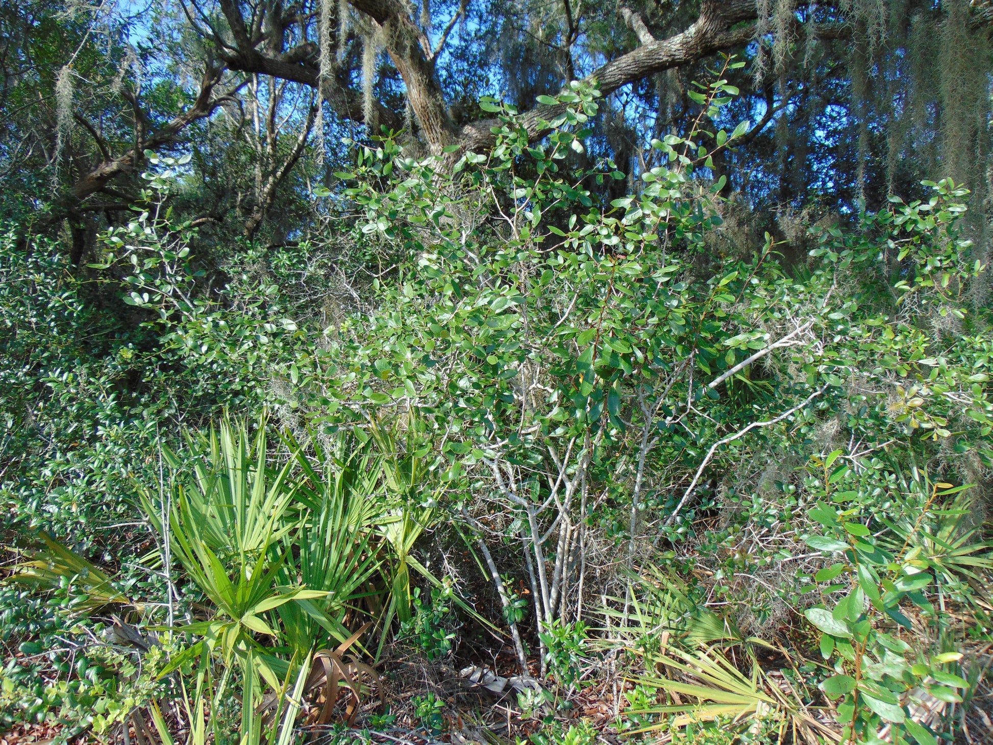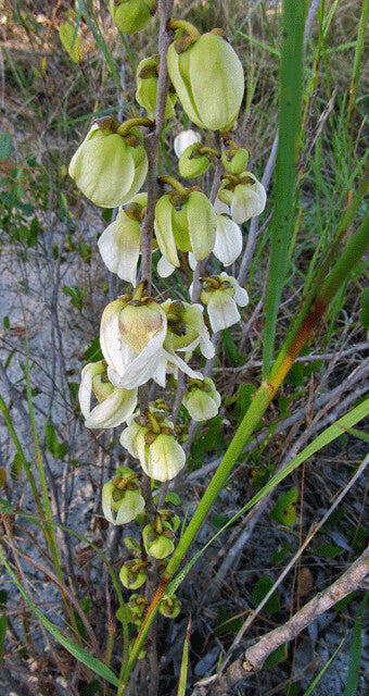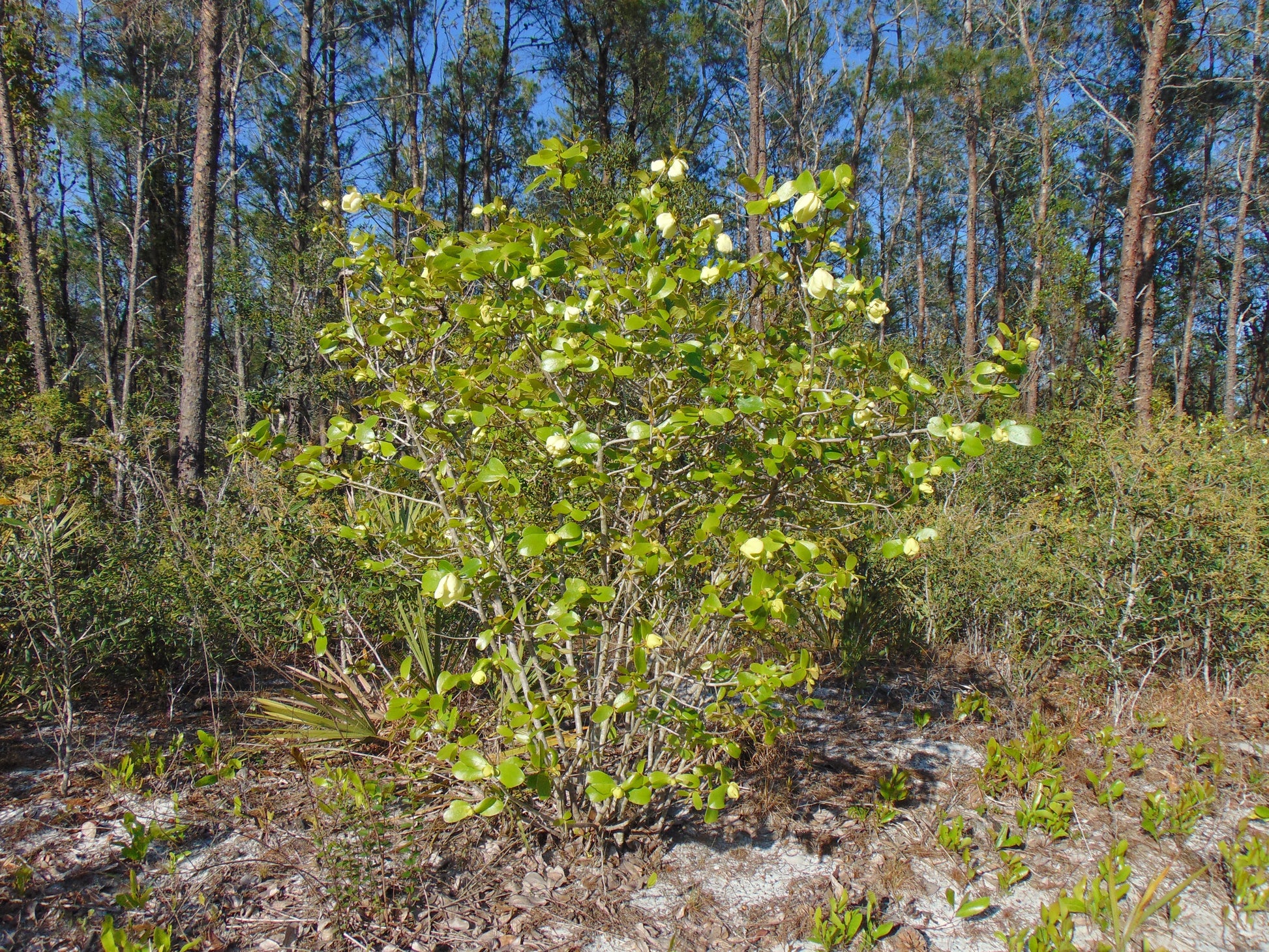 Asimina obovata, commonly known as the bigflower pawpaw, is a deciduous shrub or small tree in the Annonaceae family, native to the sandy pinelands, scrub, and coastal hammocks of Florida. This distinctive species is notable for its large, showy flowers and its adaptation to nutrient-poor, well-drained soils of the southeastern coastal plain. Typically reaching heights of 6 to 15 feet, Asimina obovata develops an upright, open form with smooth gray bark and large, obovate leaves that are bright green and slightly leathery, giving the plant a lush tropical appearance. In spring, before or as the new leaves emerge, it produces striking, creamy-white to pale yellow flowers tinged with purple or maroon at the base of the petals. These blooms are among the largest of any pawpaw species and emit a slightly fruity scent that attracts beetles and flies—the plant’s primary pollinators. Following pollination, the flowers give rise to elongated, fleshy fruits that ripen to a yellowish-green color and contain several large brown seeds surrounded by soft, aromatic pulp, which is edible and enjoyed by wildlife such as raccoons and foxes. Asimina obovata is an important component of Florida’s native ecosystems, serving as a host plant for the zebra swallowtail butterfly (Eurytides marcellus), whose larvae feed exclusively on pawpaw leaves. Thriving in full sun to partial shade, this species is drought-tolerant once established and plays a vital role in supporting pollinators and maintaining biodiversity in Florida’s sandy upland habitats.