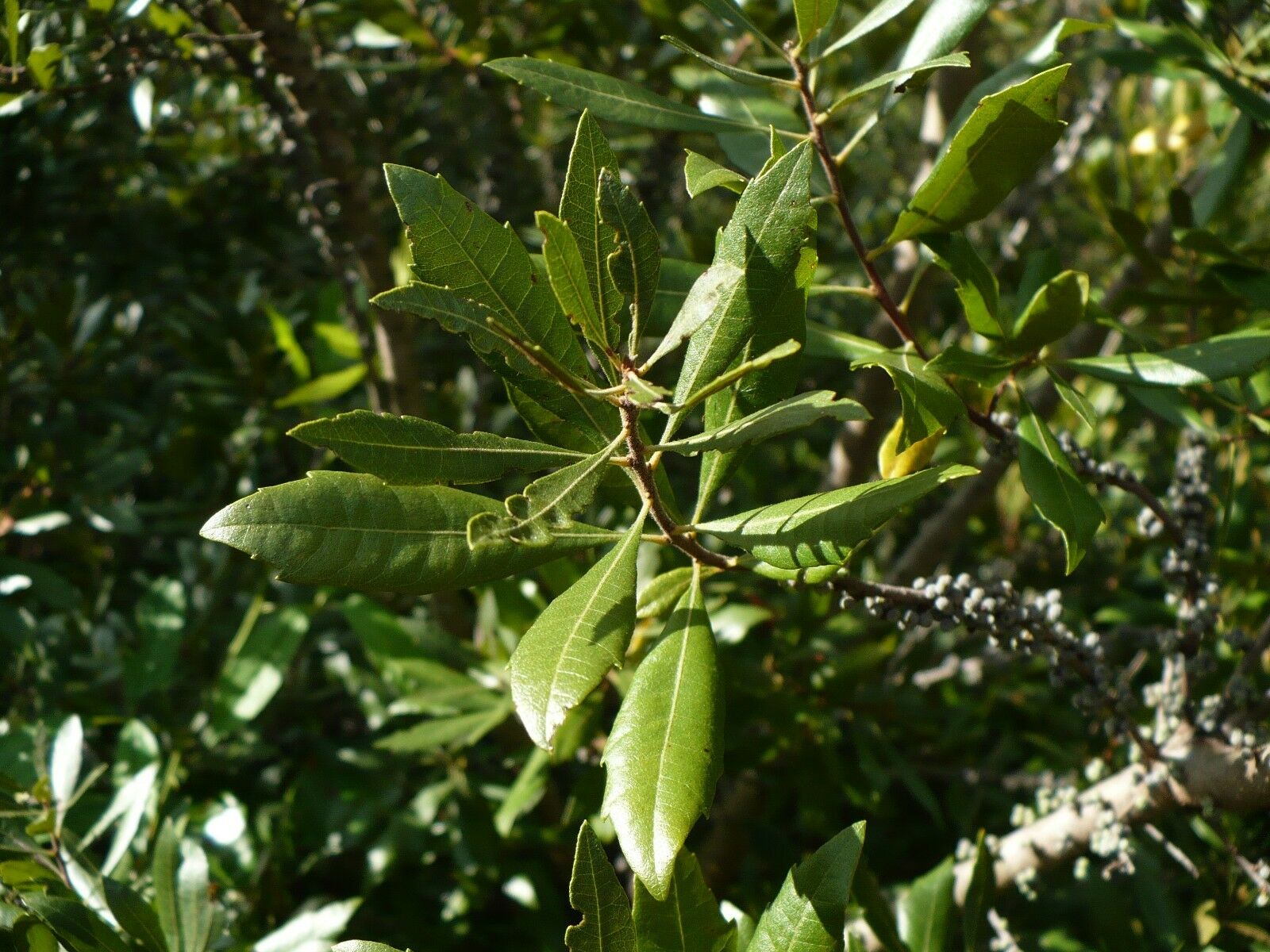 Appearance: It typically grows as a dense, multi-stemmed shrub, though it can sometimes take the form of a small tree. The leaves are aromatic, leathery, and lance-shaped, with a glossy, dark green color on the upper surface and a lighter green underside. The foliage often emits a pleasant fragrance when crushed.