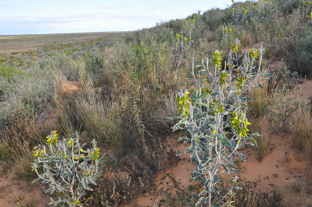 Crotalaria cunninghamii, commonly known as the green birdflower, is a perennial shrub native to the arid and coastal regions of northern Australia. It belongs to the legume family and is renowned for its unique, vibrant green flowers. The shrub typically grows between 3 and 6 feet tall, forming an open, upright structure with softly hairy, grey-green foliage that helps it retain moisture in hot, dry environments. Its velvety leaves are oval to elliptic in shape, giving the plant a silvery sheen under sunlight. Blooming primarily from spring through autumn, Crotalaria cunninghamii produces dense clusters of large, pea-shaped flowers arranged on long, terminal spikes. These brilliant green blossoms are delicately veined with blackish markings. After flowering, the plant develops inflated seed pods that rattle when shaken. Adapted to sandy and well-drained soils, this species thrives in full sun and is highly drought-tolerant, making it ideal for xeriscaping and native garden designs. It also enriches the soil through nitrogen fixation, benefiting surrounding plants in mixed landscapes. Crotalaria cunninghamii can be grown as an ornamental for its extraordinary floral display and ecological value. Its combination of green flowers, resilience, and ability to attract pollinators makes it one of Australia’s most distinctive and admired native wildflowers.
