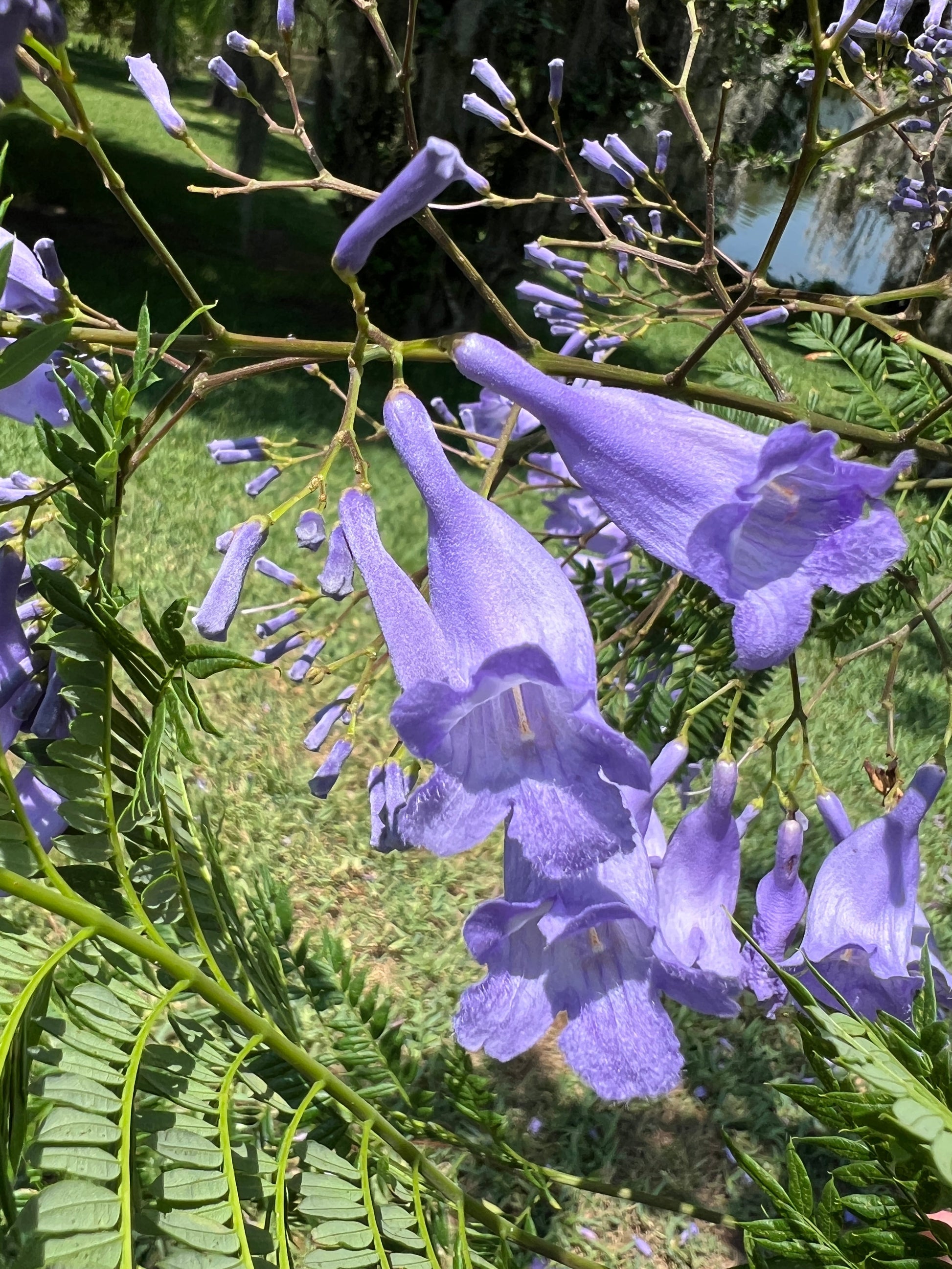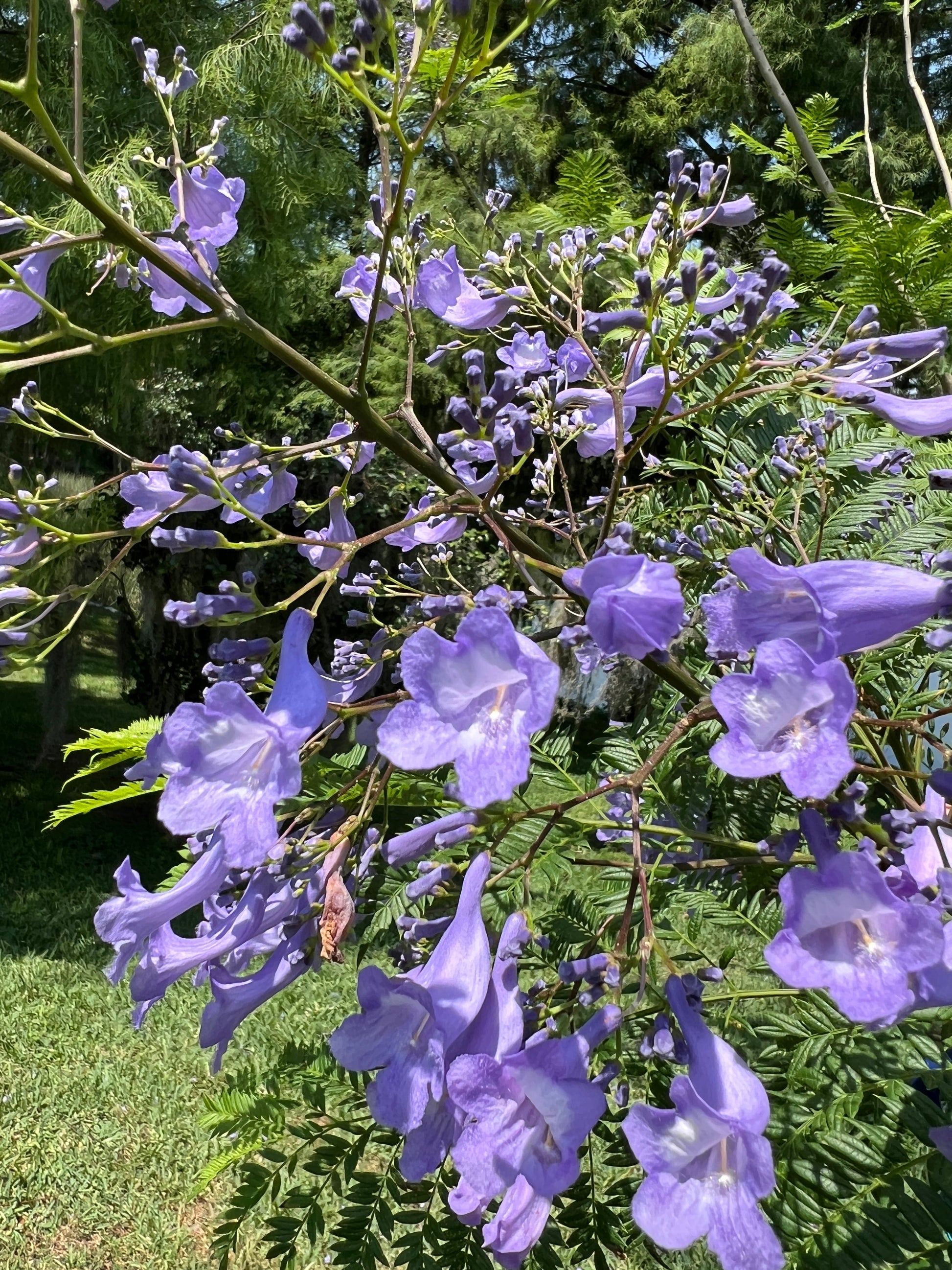 The jacaranda tree is a tropical beauty with its clusters of fragrant purple trumpet-shaped blooms. It is a deciduous tree that grows 25-50’ tall in its native habitat. In tropical and subtropical climates, it puts on a spectacular flowering display in spring to summer wherein blue-purple flowers cover the tree with bloom, forming pools of blue on the ground as they fall. Flowers (to 2” long) appear in 12-inch terminal panicles in spring and early summer. Flowers give way to flattened 2-inch capsules, each containing numerous winged seeds. The foliage of jacaranda consists of large bipinnate compound fern-like leaves (to 18” long) with tiny 1/2-inch leaflets. It is sometimes called fern tree for its fine-textured, feathery leaves. The tree can be either semi-evergreen or deciduous, depending on the climate. Most of the blooming occurs in late spring to early summer, but in warmer areas, the tree can flower at any time. It is native to Argentina and Bolivia. In the right climate, it makes an excellent shade or street tree.