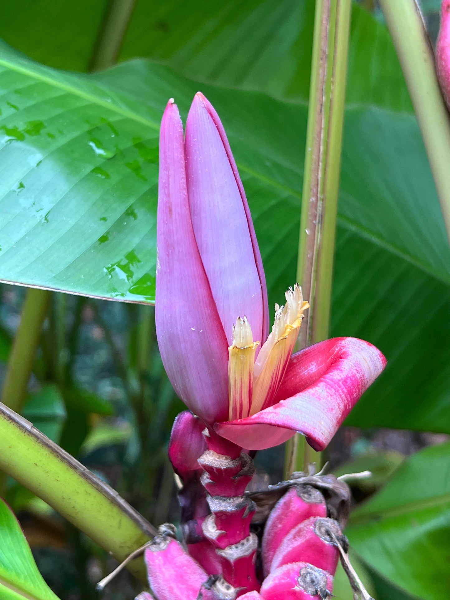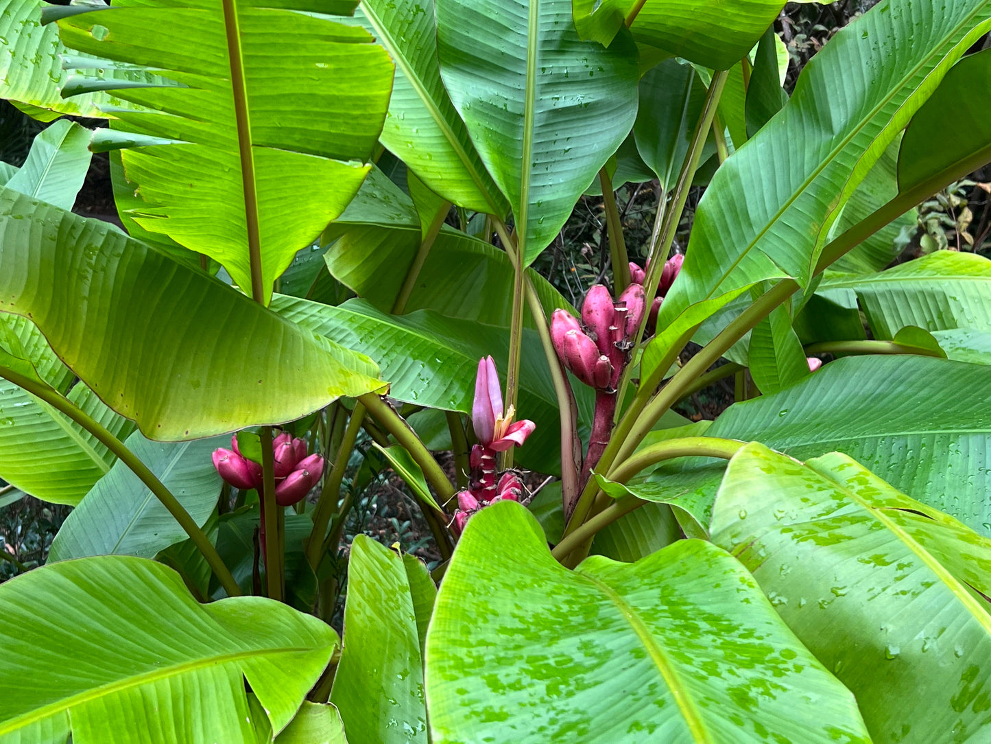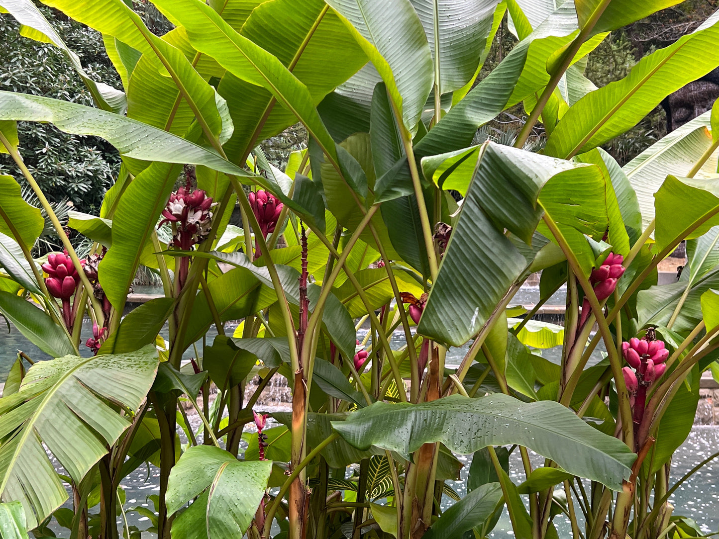 Musa velutina, commonly called the pink banana or hairy banana, is a compact and highly ornamental member of the banana family native to Southeast Asia, particularly India and surrounding regions. Unlike commercial bananas, this species typically grows only 3–5 feet tall, making it popular for tropical gardens and container culture. It features large, lush, paddle-shaped leaves with a striking midrib, creating a bold, tropical presence even in small spaces. The plant’s most captivating feature is its vibrant pink to rose-colored fruit, which appears in upright clusters above the foliage and is covered in a soft fuzzy texture—often splitting open on the plant to reveal creamy white flesh and rows of large, black seeds. The fruits are technically edible but filled with hard seeds, so they are appreciated mostly for their ornamental appeal rather than culinary value. Its flowering and fruiting can occur year-round in warm climates, as the plant produces showy, long-lasting inflorescences with bright pink bracts enveloping yellowish flowers that attract pollinators such as bees and butterflies. Musa velutina thrives in warm, humid environments with well-drained, fertile soil and consistent moisture, though it can tolerate brief cool periods; in temperate regions, it is typically grown as a potted plant and overwintered indoors. prized for its compact size, vivid tropical aesthetics, and unique fruit display, Musa velutina brings an exotic flair to landscapes, patios, and indoor garden collections.