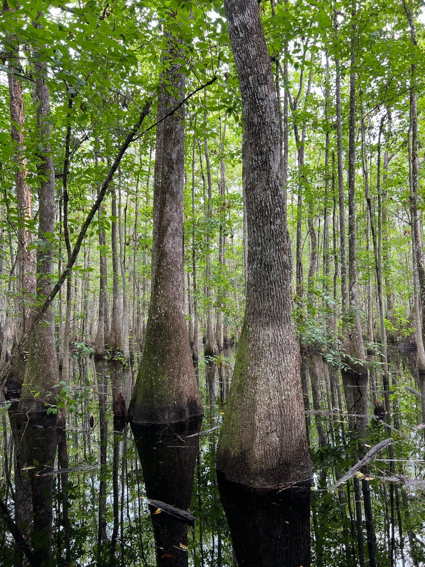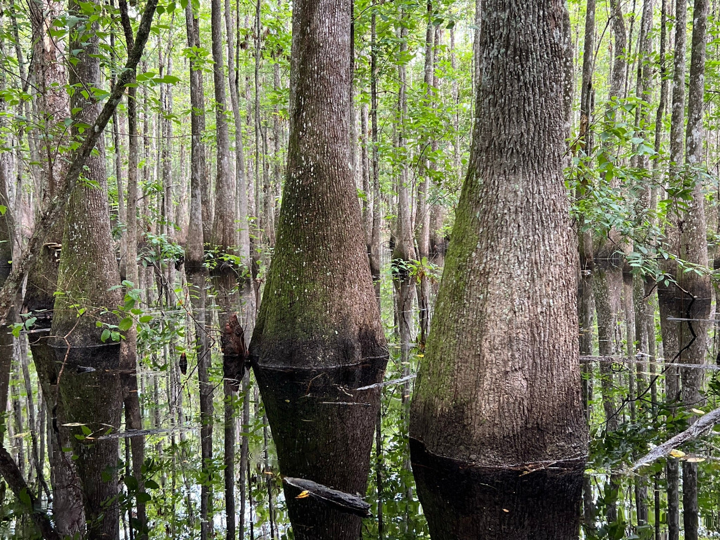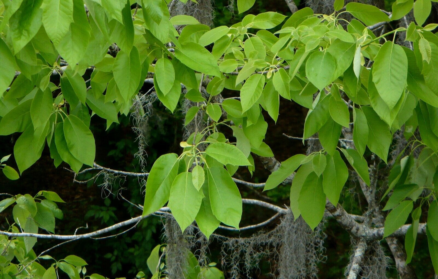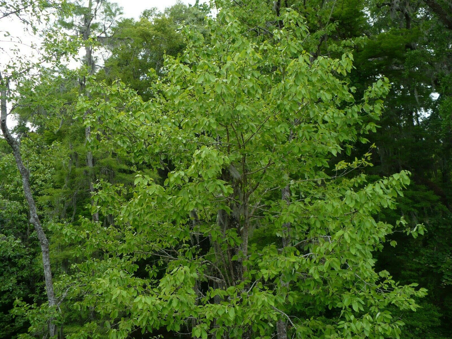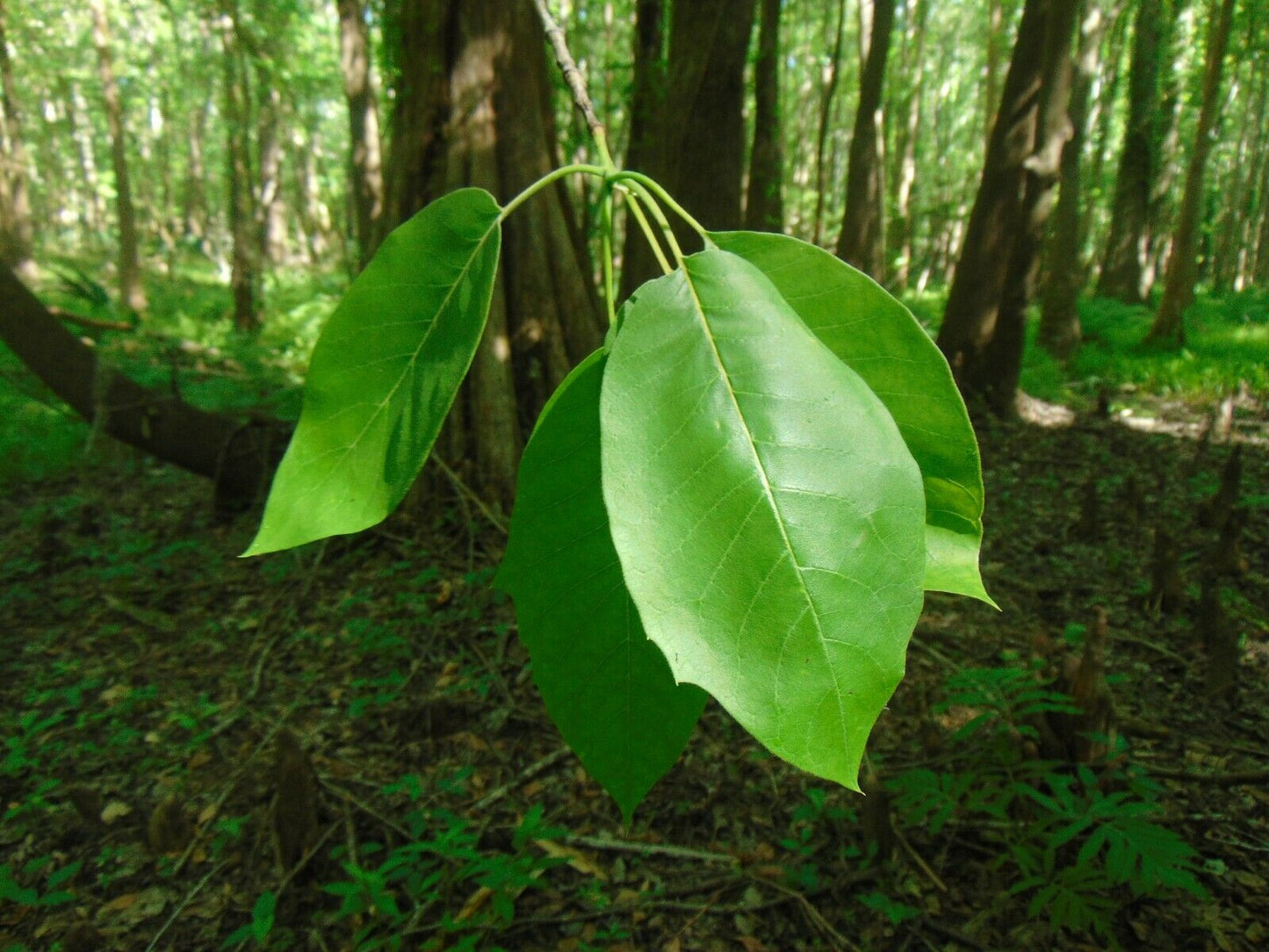 Nyssa aquatica, commonly known as water tupelo or water gum, is a large deciduous tree native to the southeastern United States, typically found in swampy lowlands, floodplains, and along the edges of rivers and bayous. It is specially adapted to wet, periodically flooded environments and often grows with its lower trunk swollen or buttressed to provide stability in saturated soils. Mature trees can reach heights of 80 to 100 feet, forming a straight trunk and a broad, open crown. The glossy, dark green leaves are simple, oval, and smooth-edged, turning golden-yellow in autumn to provide a touch of color in wetland landscapes. Small, inconspicuous greenish flowers appear in spring, serving as an early nectar source for bees, while the oval, bluish-black fruits that follow are relished by ducks, songbirds, and other wildlife. Nyssa aquatica thrives in full sun and prefers deep, moist to wet acidic soils, though it can tolerate occasional drought once established. Its strong wood and ability to thrive in standing water make it ecologically important for flood control and habitat diversity. As an ornamental or restoration tree, water tupelo is valued for its form, glossy foliage, and adaptability to wetland and riparian plantings, contributing both beauty and ecological function to aquatic landscapes.